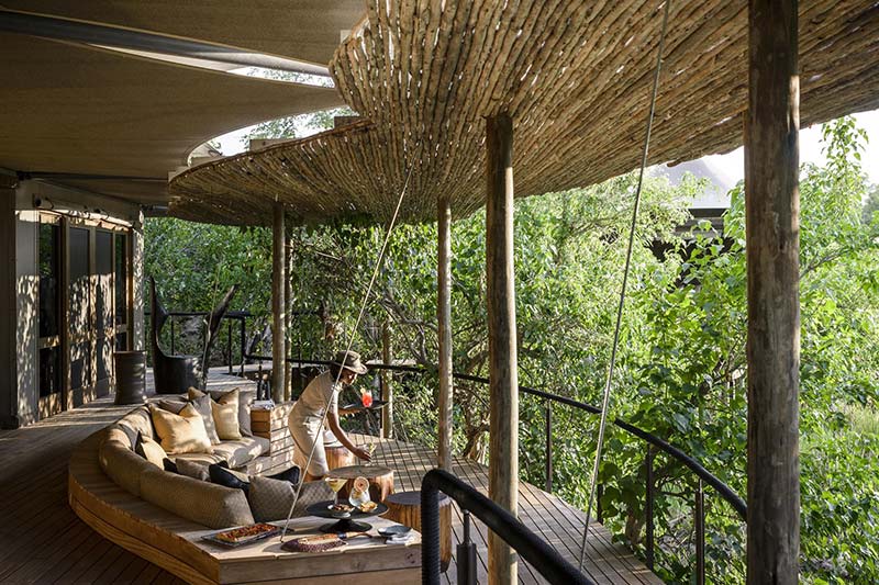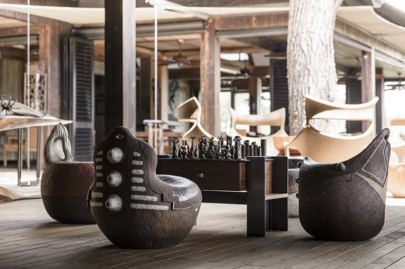 Activities are dependent on water levels. When flood water levels allow, superb boat cruises and glass bottomed mekoro can be enjoyed. When the flood has receded, game drives and nature walks (provided the grass is not too long) can also be enjoyed. Catch and release fishing is available between March and December. There is also plenty to enjoy without leaving the lodge including a self-guided art and design tour (with audio guide and a specially created map) and scheduled yoga classes. At extra cost, it is possible arrange a sleep out experience at the impressive Baobab Treehouse, which is located one kilometre away from the lodge out in the bush. The treehouse has a sculptural design, built of steel to look like a baobab tree, rising around 10 metres above the floodplain. There are three floors to the treehouse, all linked by a spiral staircase – the bathroom is on the first floor, and a bedroom is on the second floor. Both bedroom and bathroom have roll down canvas sides with screen mesh, so guests can choose whether to leave them open to the elements, or zip them closed. There is then a top deck which is open air and where guests can enjoy sundowners and a picnic-style dinner (it is also possible to make a king size bed up on the top deck and enjoy the night under the stars).