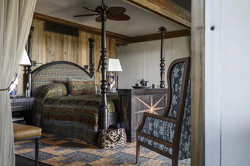 Accommodation is offered in 12 luxurious tented suites each overlooking the floodplains. The suites are built onto raised wooden platforms and have polished timber flooring. Each spacious suite consists of a lounge, bedroom and large en suite bathroom with double basin, flush loo, freestanding bathtub and both indoor and outdoor showers. To the side and fore is an outdoor deck with a shaded sala and daybeds from which to enjoy the views. One of the suites is a two bedroomed family suite which has an additional en suite bedroom accessed from the shared lounge. The second bedroom is slightly smaller with a bathroom at the back of the bedroom rather than to the side. As well as air conditioning, each suite comes with a flat screen TV, mini bar, tea and coffee making facilities and full room service.