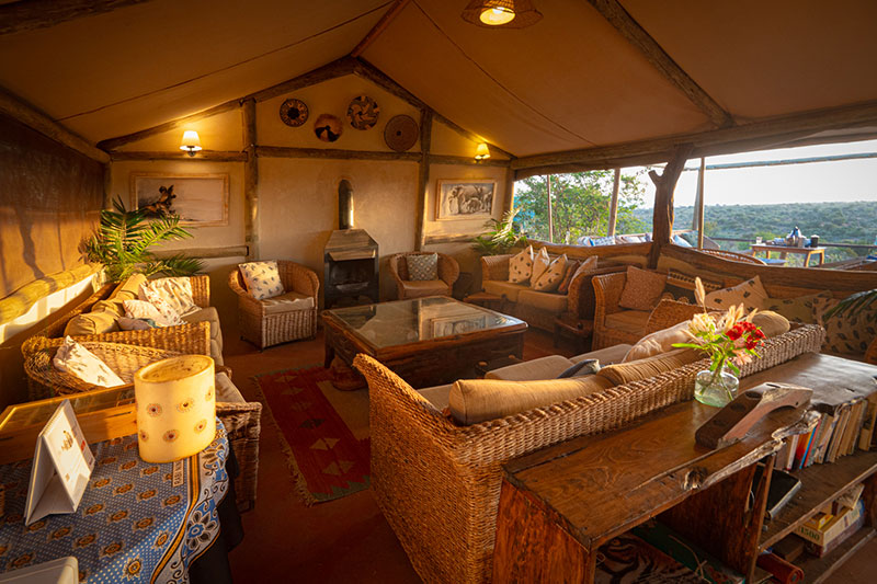 The tented central areas are built onto a wooden deck and include an indoor lounge with fireplace, an indoor dining area, and a deck with comfortable sitting areas and al fresco dining space. To the rear of the camp is a lovely sundowner spot overlooking a wide valley and the Ewaso Narok River, complete with a ‘swing bed’ on top of the hill – the perfect place to unwind for a few hours with a book and your binoculars.