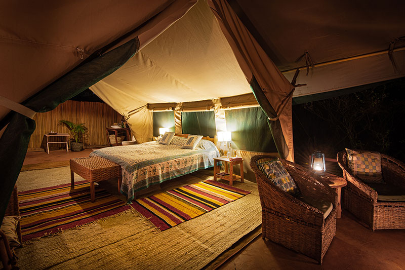 Laikipia Wilderness has six en suite tents set across the hillside with views over the bush. Each of the Meru style tents is set on a solid plinth, or low wooden platform, and has a private verandah to the front and semi-open air bathroom to the rear, enclosed by a reed wall. The sleeping area is comfortably furnished with luggage racks and bedside tables. The plumbed bathroom uses river water for the toilet, shower and sink with bottled water provided for drinking and brushing teeth. Four of the tents have an additional tented bedroom attached to the main bedroom, creating space for families who wish to be together under one roof.