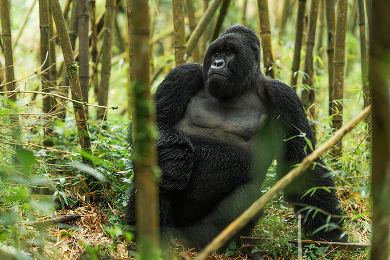 There are currently 12 habituated mountain gorilla families. Some groups are considered easier to locate (less walking), though tough walking up and down slopes through thick vegetation should still be expected, especially if the gorillas are mobile when you find them. A maximum of eight people is taken in each trekking group, and you are led by a local guide. Trekking for gorillas in Rwanda can be slightly easier than in Uganda. However, a good level of fitness is required as the terrain over which tracking takes place is extremely difficult (and remember, you’re already at altitude before you even start trekking). Treks can last anything from an hour (on well-worn tracks which present little difficulty) to well over five hours, traversing steep-sided mountains and ravines, often clambering over nothing but suspended vegetation.