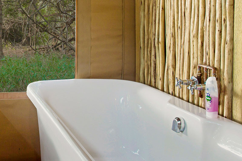 Accommodation is provided for up to 16 guests in seven thatched safari units. Each en suite unit is raised on a wooden platform with a furnished veranda to the fore. Sliding doors lead into the light and airy bedroom furnished with double or twin beds, a ceiling fan and mosquito net, writing table, wardrobe space and easy chairs. The bathroom contains a flush toilet, wash basin and has a door leading to an outside shower (some of the tents have covered showers). The family units plus one of the double tents also have a bathtub. Note that hairdryers cannot be used due to the limits of the solar power system.