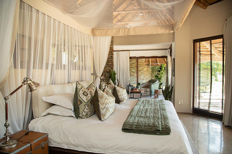 The lodge accommodates up to 16 guests in seven one-bedroomed and one two-bedroomed suites. The five Luxury and two Luxury Pool suites all have views of the bush and are built under cooling raised thatch. The basic layout of the suites is the same although the Luxury Pool suites occupy a more private location at either end of the property and have a four poster bed and private plunge pool. The air-conditioned suites are extremely spacious with an open plan bedroom, bathroom, and lounge leading to a private terrace overlooking the natural bush. Bathroom facilities include a double vanity, free standing bath, both inside and outside showers and separate toilet. Each is custom furnished and contains a minibar and fridge, tea/coffee facilities and a room safe. The two bedroomed Marula Suite is suitable for up to four guests and comprises of two en suite bedrooms either side of a shared lounge, dining room and kitchen (although meals are generally taken at the main lodge). The suite also has a large outdoor deck, private boma, fire pit area, swimming pool and benefits from a private vehicle and guide when booked by four guests.
