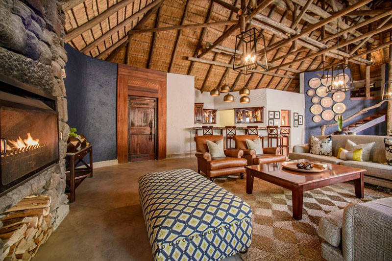 The lodge’s central areas contain an open plan lounge with fireplace, a bar, a wine cellar and dining area (dining in the evening is mostly communal). There is an upstairs library (with computer facilities) and a games room which overlook the lodge swimming pool. There is a curio shop, a small air-conditioned gym and a library. Massage treatments can be arranged in guest rooms.