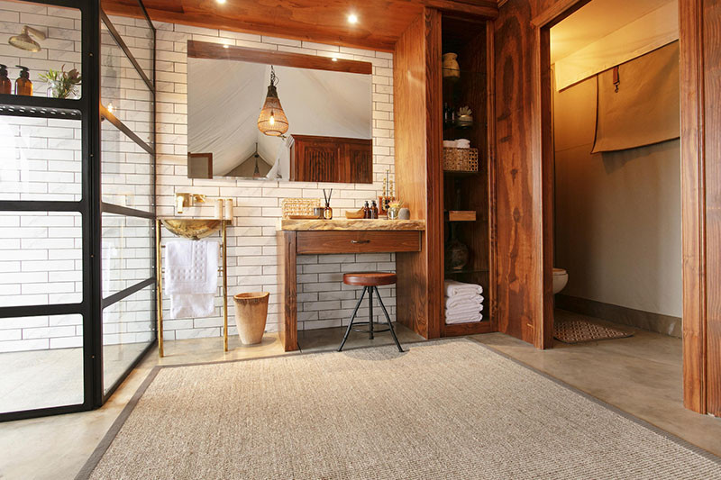 The intimate camp sleeps up to eight guests in four spacious en suite tents, all overlooking a waterhole with views of the Drakensberg Mountains beyond. The tented rooms lie to either side of the central area, with each tent built on to stone plinth with wooden deck to the side. Sliding glass and gauze doors lead into a light and airy bedroom space with bed with mosquito netting, fan, writing desk, seating area and en suite bathroom with toilet, free standing bath and indoor and outdoor shower. Please note that the bathroom is only separated from the bedroom by a screen so the accommodation may not be ideal for friends travelling together.