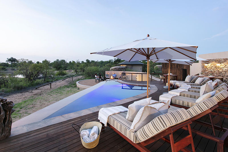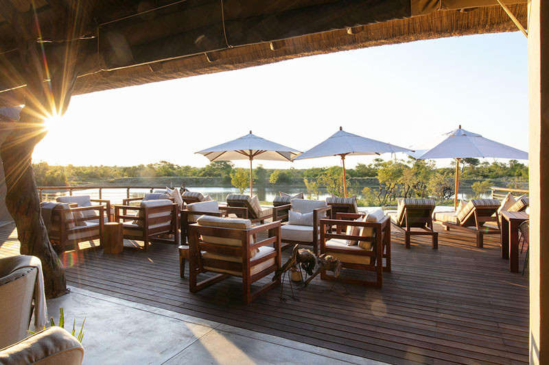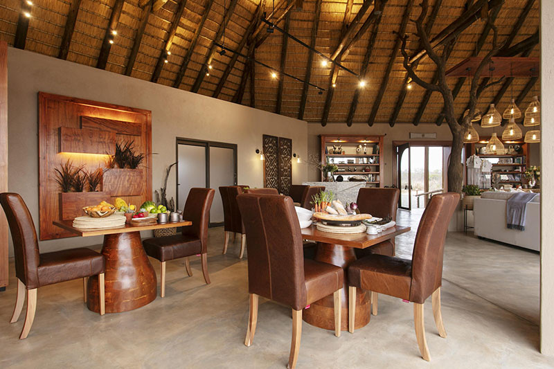 The stylish main area features an open plan reception and lounge area under thatch, a library corner, a bar and dining area, a viewing deck, curio shop and infinity swimming pool.