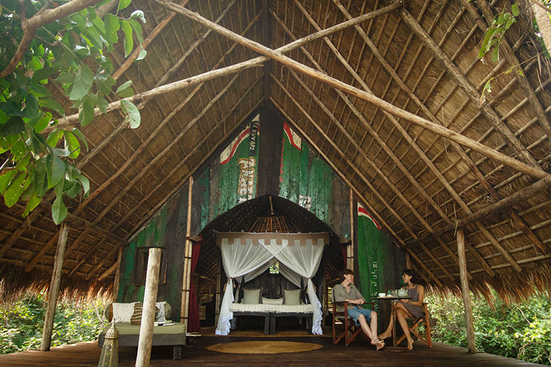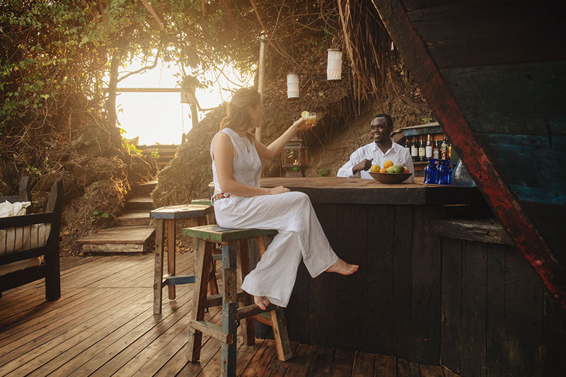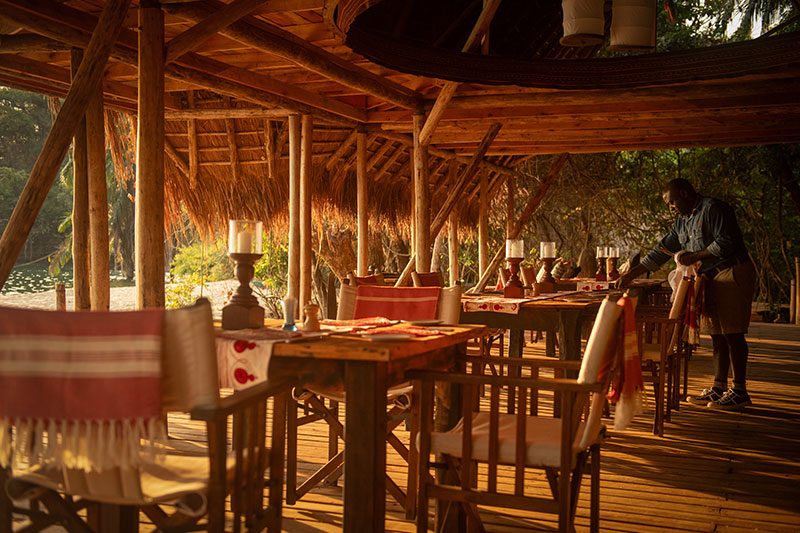 The thatched lounge and dining area sits impressively on the beach – dining takes place on the ground level or on the beach, while there are comfortable seating areas downstairs and upstairs, along with a library. There is also a small curio shop. A wooden walkway leads out over the water to a lookout bar built on top of a promontory where guests meet each evening to discuss their chimp trekking experiences of that day.