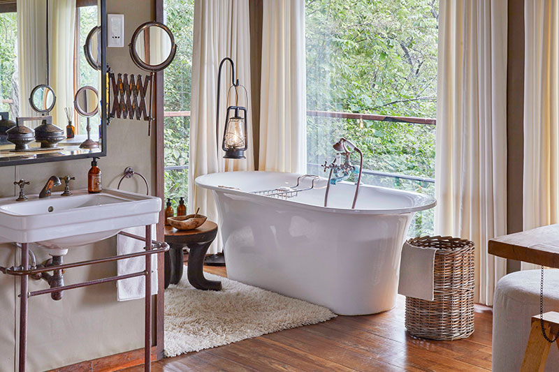 Accommodation is provided for a maximum of 24 guests in 10 luxury tented suites, privately set through the bush and accessed via low wooden walkways. Each suite has king/twin beds, a small lounge area and huge windows to the fore looking onto your private viewing deck with superb views of the bush. The large en suite bathrooms have traditional style fixtures with large soaking tubs and both indoor and outdoor showers. All of the suites have an ‘Evening Breeze’ cooling system over the bed, a minibar, telephone, hairdryer and safe. Two sets of rooms are linked by an external deck and are therefore suitable for families or friends travelling together.