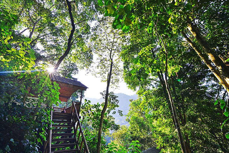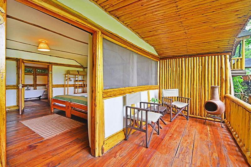 Each of the 10 cottages are made from timber with gauze windows and thatched roofs. They are comfortably furnished and have en suite facilities with hot/cold running water, shower (some chalets also have a bath tub) and flush loos. They also have a private verandah with views over the forest. Lighting and power is provided by solar. One of the cottages is a family room with an extra sitting area which can be used for extra beds.