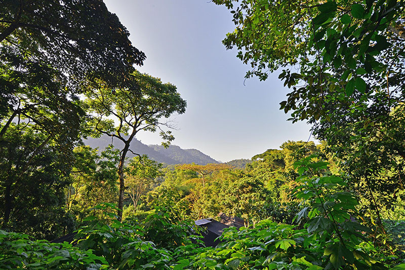 The central building is raised off the ground and open fronted with views towards the forest and includes a cosy lounge with fire place, and a bar/dining room where meals are taken and hot drinks are available all day. There is also a small spa where they offer a complimentary massage.