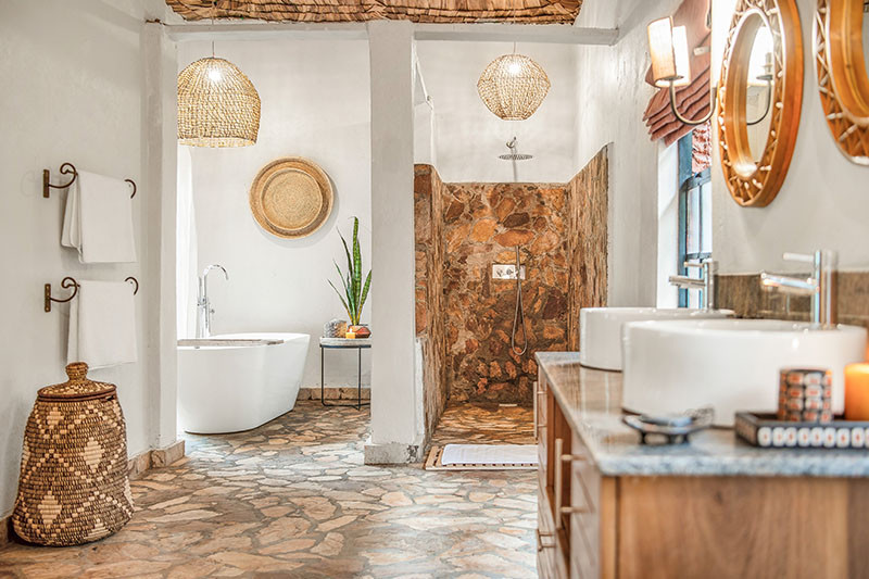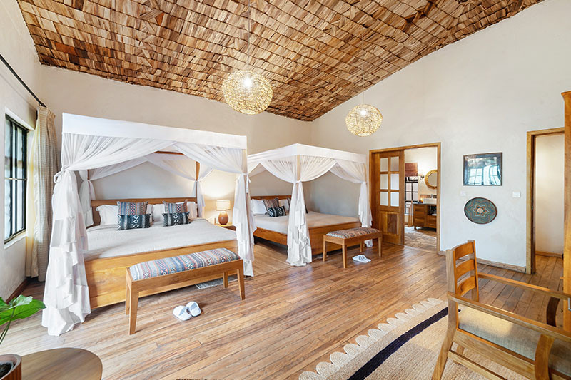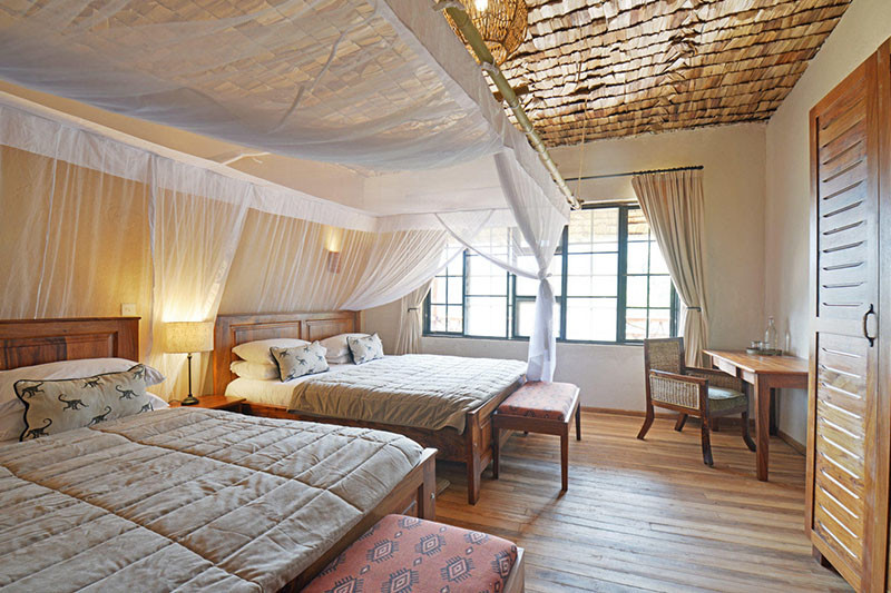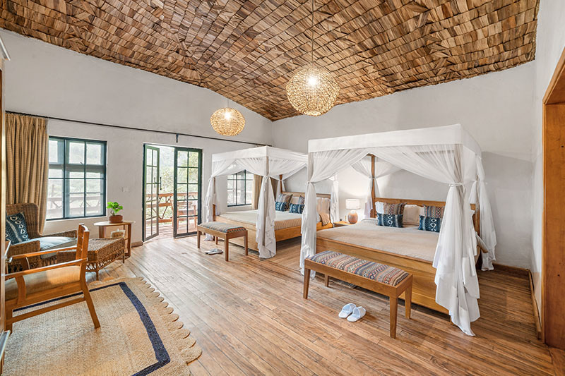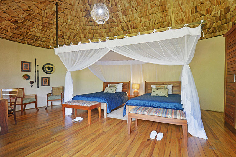 Accommodation is provided in 14 spacious suites – 12 Superior Bandas (of which two are honeymoon suites and two are family suites) and two Premium Deluxe Suites. Each suite has twin or double beds, a dressing table, mosquito net, 24 hour lighting and in-room power and en suite bathroom facilities including wash basin, loo and shower. Each of the suites is slightly cantilevered off the ground and has a private wooden veranda to the front with views over the surrounding area. The two honeymoon suites have super-sized beds plus a bathtub (in addition to the shower); while the two family suites each comprise two en suite bedrooms and a central lounge. The Premium Deluxe Suites are the largest of all the suites, each comprising two bedrooms with two king size four poster beds in each bedroom, two bathrooms (one with a bath in addition to the shower), a central lounge with fireplace and large private terrace with hot tub. Private dining is an option in the Premium Deluxe Suites and these come with the services of a butler.