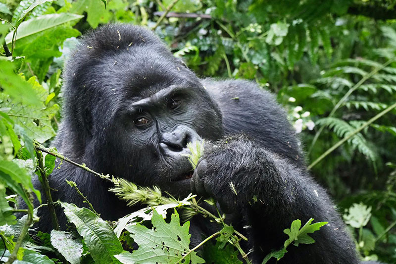 The main activity in Bwindi is gorilla trekking, and there are currently 17 habituated groups which can be visited in various areas of the park. However, please bear in mind that the high rainfall and terrain make trekking very difficult and you need to be well prepared. To trek for gorillas, a good level of fitness is required as the terrain over which tracking takes place is extremely difficult. Treks can last anything from roughly two to six hours, often traversing steep-sided mountains and ravines, and regularly clambering over ground vegetation. Temperatures can range from being very warm and humid to being very cold, and rain can fall at any time. Permits must be purchased in advance. Children under 15 years of age are not allowed to trek.