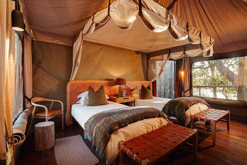 The camp accommodates around 10 guests in four tented chalets, each built on to a large raised wooden platform. The tents are very spacious with a comfortable indoor sitting area. The semi-outdoor en suite bathroom includes plumbed shower, double vanity, flush loo and bathtub. Each tent has a wonderful view over the dambo and a wooden platform with relaxed seating from which to enjoy your siesta. One of the tents is a family tent which has a second en suite twin bedroom leading off the sitting area and comes with its own private guide and vehicle.