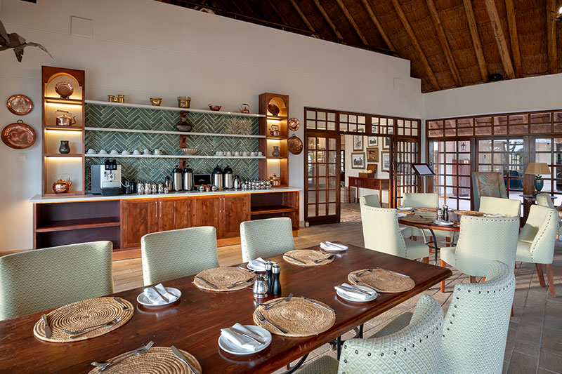 The main areas of the hotel are built beneath a huge thatch roof, which covers the reception area, the the restaurant and the bar. Surrounding the main areas are lawns leading into the bush and a spacious terrace that extends around a small swimming pool and poolside lounge, beyond which is an additional plunge pool. There is also a small health spa.